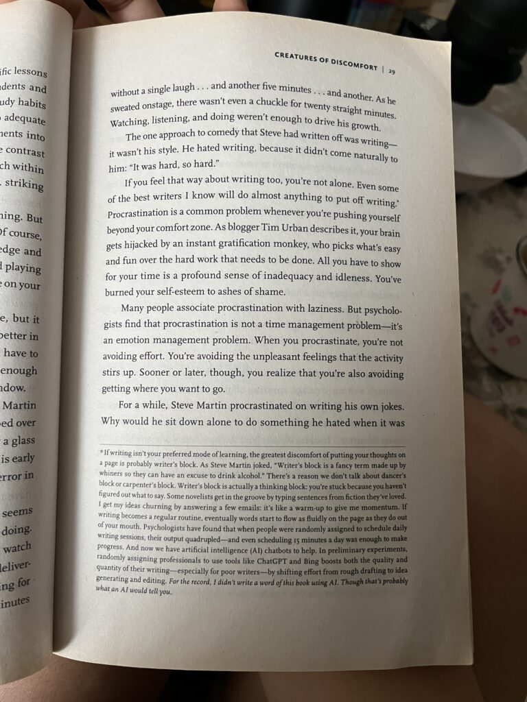 In this instance, I reckon it’s about facing the discomfort of writing and pressing the “Publish” button. I have grown very comfortable with writing over the past year. Draft after draft lives quietly in my notes though… *internally screaming oh my gawd!*